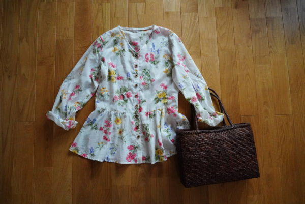 ボタンはウッドボタンにして楽しみました。何より2年間待たせていた好みの生地がブラウスになる喜びは、他にない満足感がありますね。