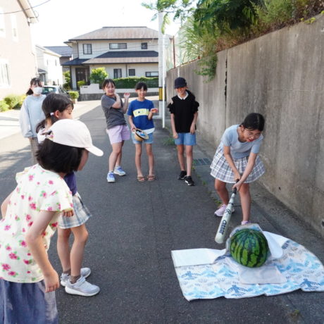 やったことがない子供は、金属バットを持つのも怖いし、目隠しも怖くて、最初は「やらないっ!!」とみんな言うのですが、上学年の子ども達が楽しそうに目隠しをしてスイカ割りをしていると、「やっぱり、やってみる!」とか、「ちょっとやろうかな!」という気持ちが芽生えて、2周目くらいから参加してくれます。