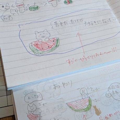 毎回ノートに振り返りを書いてもらいますが、イラストもとっても可愛いので写真を撮りました。毎日、毎日、暑い日が続き、汗びっしょりになりますが、夏らしい企画をして、子ども達と楽しめることが幸せだな!と感じた時間です。