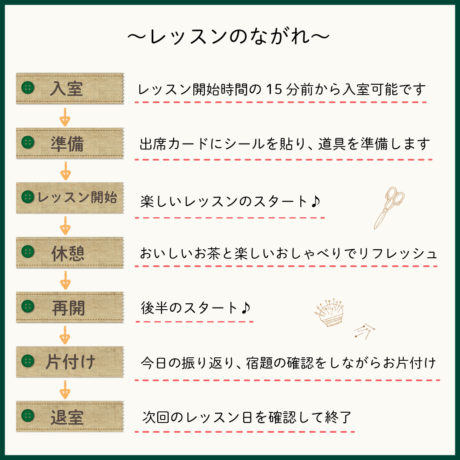 また、午前クラス、午後クラスどちらも下記のような流れでレッスンを運営しています。